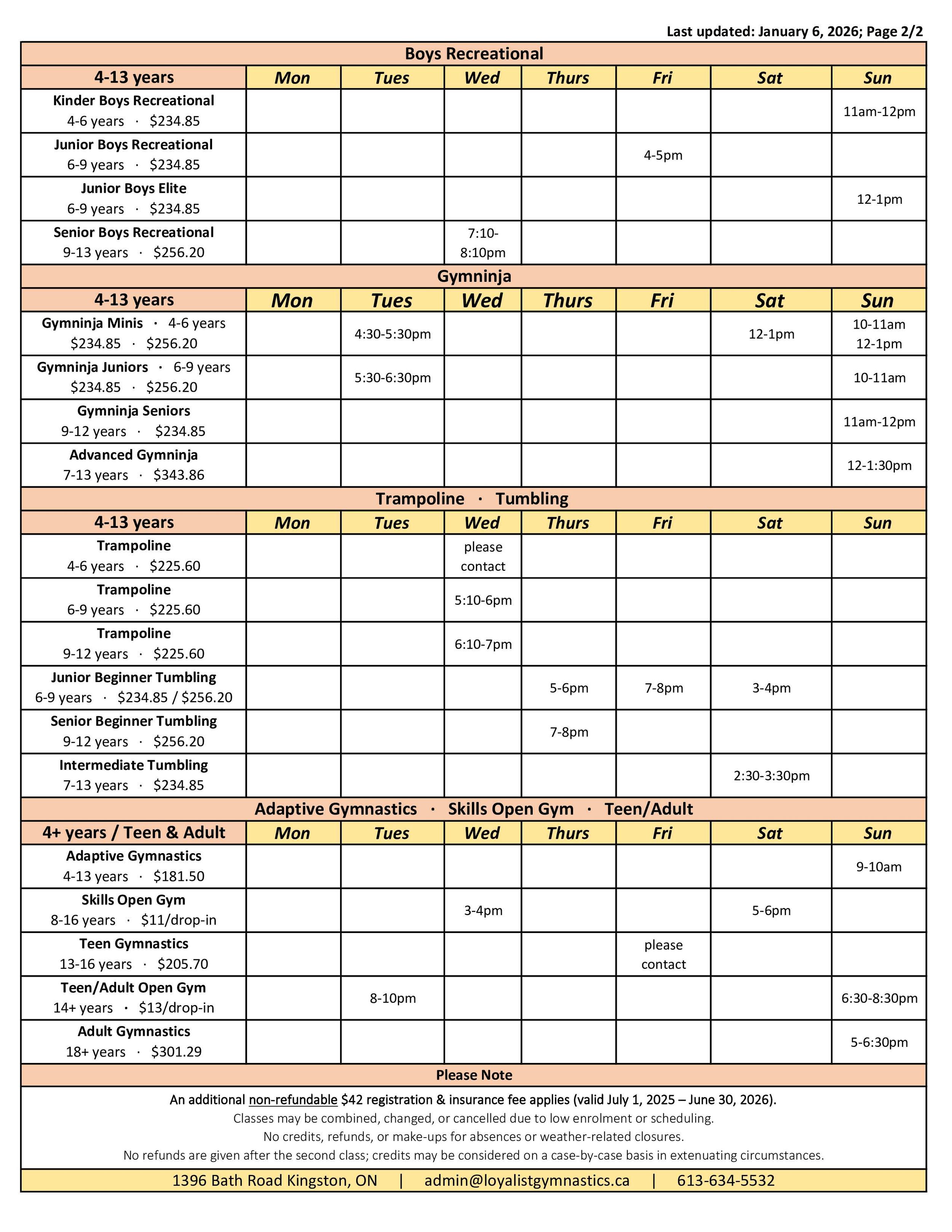 Winter 2026: We still have a few spaces available in our Winter 2026 session! Please click the “Register Here” link above to view available classes. Registration will close on Sunday, January 25th. After this date, please contact us at recdirector@loyalistgymnastics.ca if you are interested in joining an available class at a prorated fee.